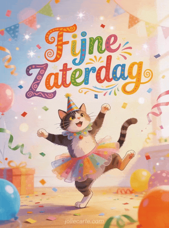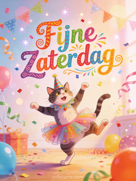 Stuur een absurd grappige zaterdaggroet met een hilarische kat in een belachelijk kostuum die een gekke dans doet omringd door feestdecoraties. Bekijk ook een fijne dag fijne zaterdag of een fijne zaterdag in de regen humor.