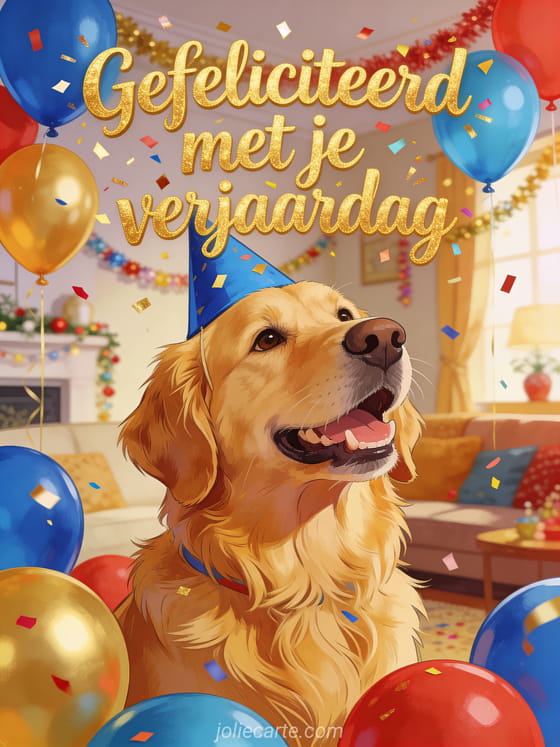 Verras hem met een warme verjaardagskaart. Een prachtige lachende golden retriever met een blauw feesthoedje, omgeven door kleurrijke blauwe, gouden en rode ballonnen en slingers in een feestelijk ingericht salon. Ontdek ook een virtuele verjaardagskaart man gratis of een geanimeerde verjaardagskaart man.