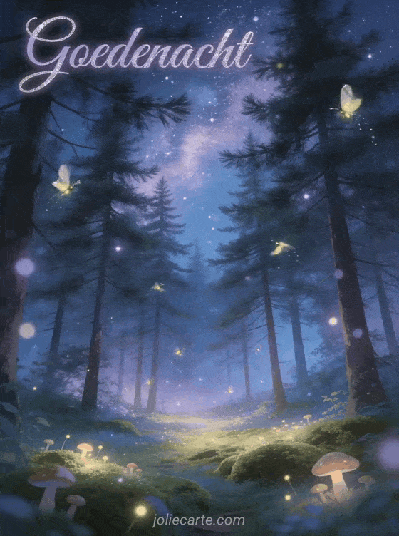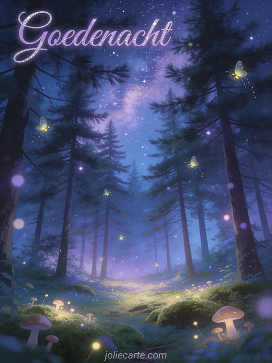 Stuur een betoverende kaart om goedenacht te wensen via deze gratis wenskaart. Een betoverd bosopen plek bij nacht met magische vuurvliegjes tussen hoge dennenbomen, een tapijt van zachte mos met kleine gloeiende paddenstoelen en de melkweg boven de boomkruinen. Bekijk ook een afbeelding fijne avond en goedenacht kussen gif of een goedenacht mijn liefste.