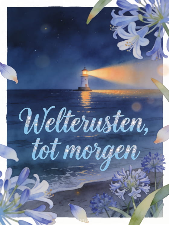Zeg welterusten en tot morgen met een aquarelvuurtoren die een warme straal over een kalme nachtzee werpt, met agapanthusbloemen op de voorgrond. Ontdek ook een geanimeerde welterusten kaart, een bericht om welterusten te wensen of een fijne avond en welterusten bericht.