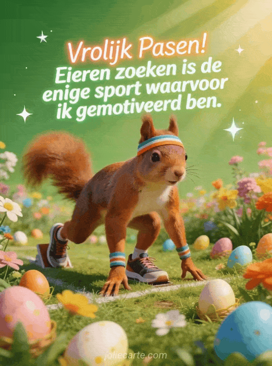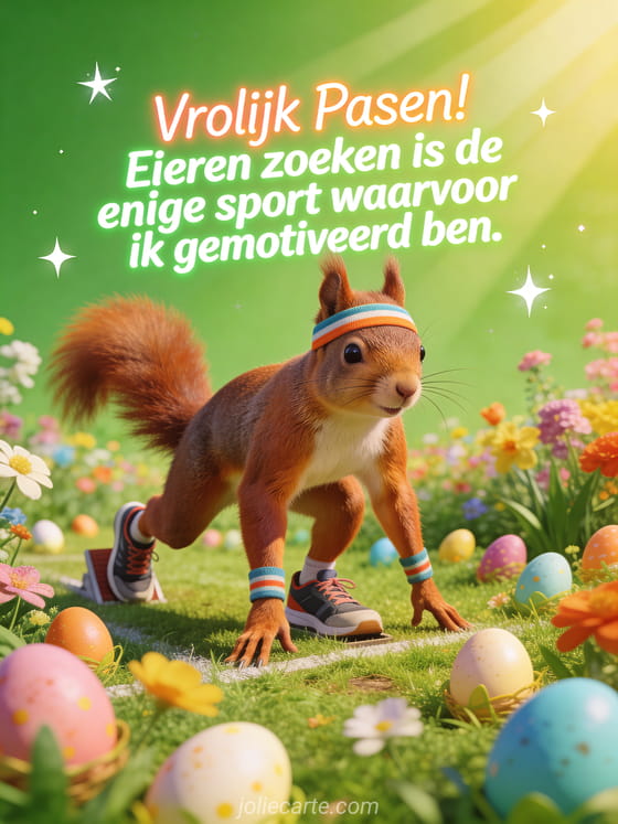 Stuur een humoristische paaskaart met een eekhoorn in sportkleding die eieren zoekt als enige sport. Ontdek ook een vrolijk pasen humor volwassenen of een vrolijk pasen humor vrouw.
