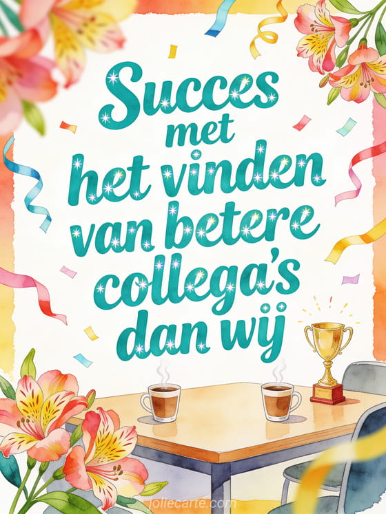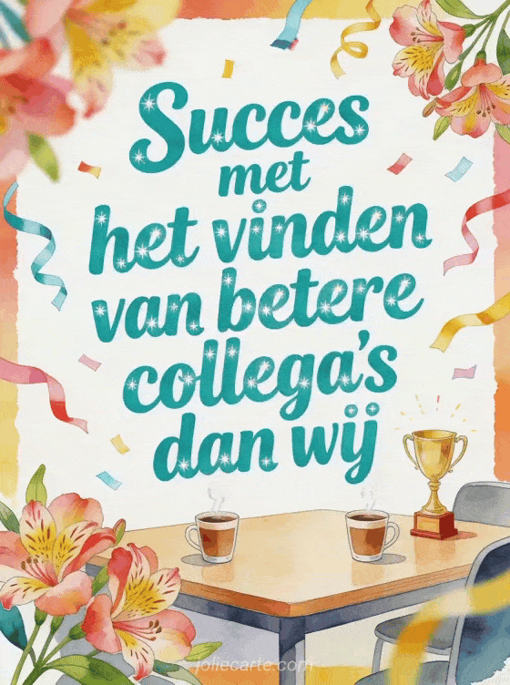 Deel een speels afscheid met een lichte pauzeruimte, dampende koffiekopjes, een kleine trofee, papieren serpentines en alstroemeria. Bekijk ook veel succes gifs, tot ziens en veel succes kaart of tekst om succes te wensen.