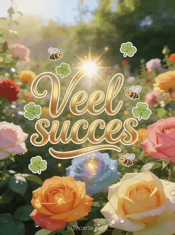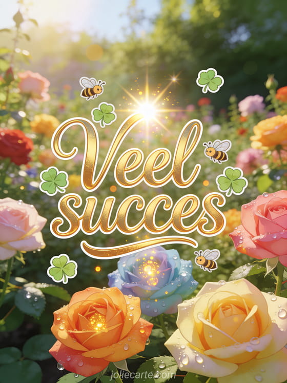 Stuur een vrolijke kaart veel succes nieuwe baan met gouden cursieve letters, kleintjes klavertjes vier en vrolijke bijtjes rondom de tekst, en een prachtige rozentuin in bloei badend in zonnig ochtendlicht.