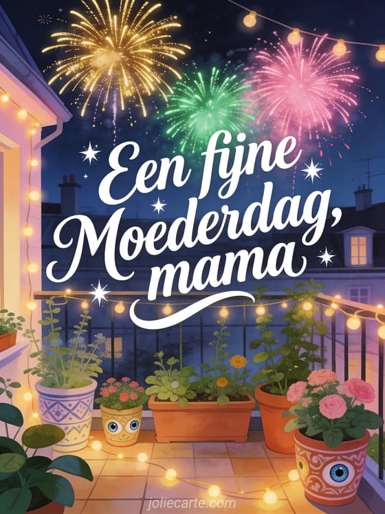 Vier met deze levendige kaart voor moederdag. Een daktuin bij nacht met spectaculair vuurwerk dat de hemel kleurt in goud, groen en roze, mooie anjers in decoratieve potten en warm sfeerlicht. Ontdek ook fijne moederdagwensen of wensen voor moederdag.