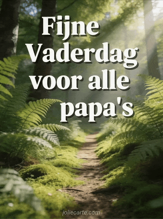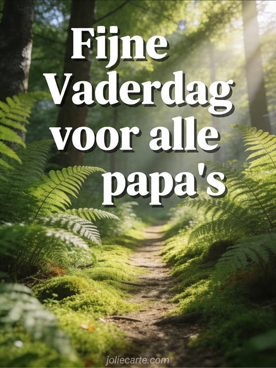 Stuur een kaart voor vaderdag papa met een helder lentebospad, groene varens aan beide kanten, dik mos en zonlicht door het bladerdak. Ontdek ook fijne vaderdag voor mijn zoon en alle papa's, een voorbeeld vaderdagkaart of een vaderdag tekst.