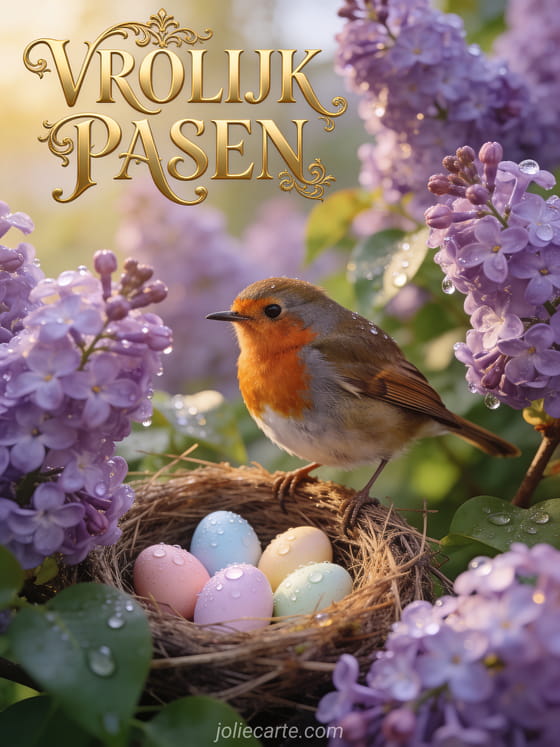 Kaart vrolijk pasen een tere paaskaart met een roodborstje op een nest vol pastelkleurige eieren