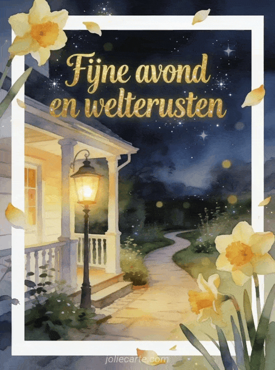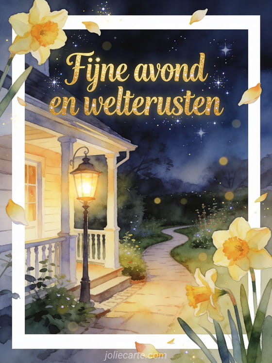 Deel fijne avond en welterusten met een aquarelkaart waarop een tuinpad, een gloeiende veranda lantaarn, narcissen en de eerste sterren staan. Ontdek ook een kaart met welterusten wensen, gratis geanimeerde virtuele welterusten kaarten of prachtig welterusten bericht.