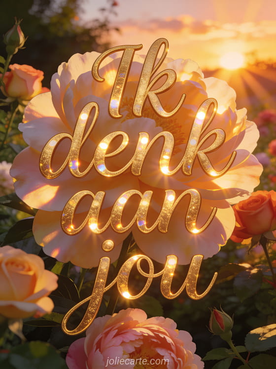 Stuur een lichte en tedere kaart met een bloementuin vol rozen en pioenrozen in gouden avondlicht bij zonsondergang om iemand te laten weten dat je aan hem denkt. Bekijk ook een afbeelding ik denk heel sterk aan jou, ik denk aan jou kat of vanavond denk ik aan jou.