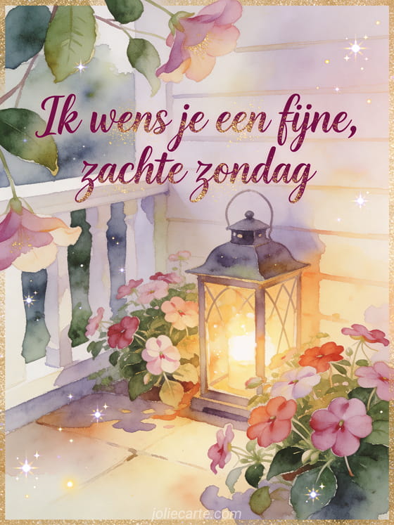 Wens een zachte fijne zondag met een gloeiende lantaarn tussen impatiens in een heldere patiohoek, vol warme nevel en sprankeling. Bekijk ook regenachtige fijne zondag afbeelding, fijne zondag kusjes geanimeerde gif of fijne zondag berichten.