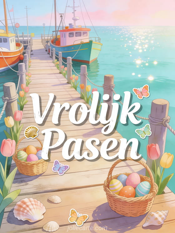 Stuur een serene paaskaart met een charmant visserhaventje met kleurrijke boten, paasmanden vol beschilderde paasei op de houten steiger en lentetulpen die groeien tussen de meerpalen. Ontdek ook een gratis digitale paaskaart of een gratis pasen felicitatie.