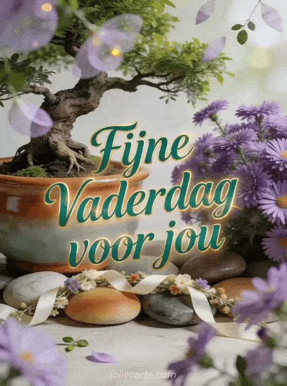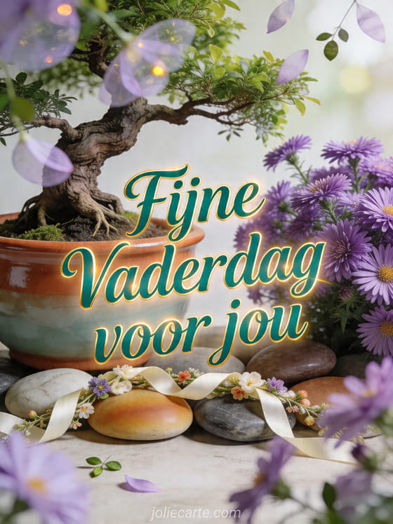 Stuur kaarten voor vaderdag met zelfverzekerde smaragdgroene letters, een realistische bonsai naast paarse asters, gladde keramische stenen en een kleine feestelijke slinger in een serene vrolijke sfeer. Bekijk ook fijne moederdag mama en fijne vaderdag papa, een fijne Vaderdag papa tekst of een gratis kaart fijne vaderdag.