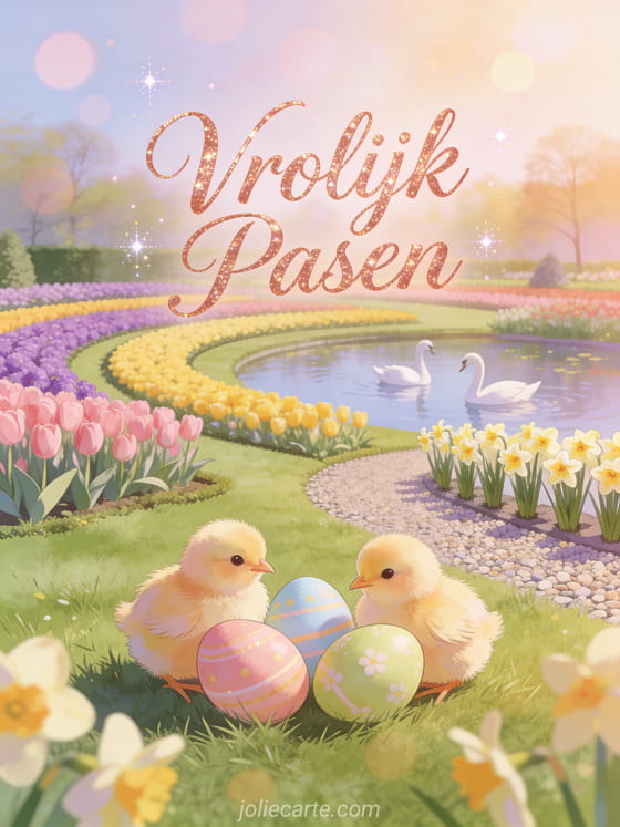 Stuur een vrolijke paaskaart met twee schattige babykulkens zittend naast beschilderde paasei op een verzorgd Keukenhof gazon, met uitgestrekte geometrische bloemperken van tulpen in roze geel en paars en een serene vijver met zwanen in het midden. Ontdek ook een gratis paaskaart of een gratis paaskaart dromadaire.