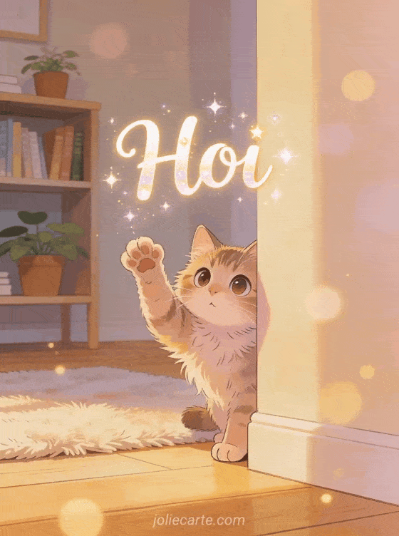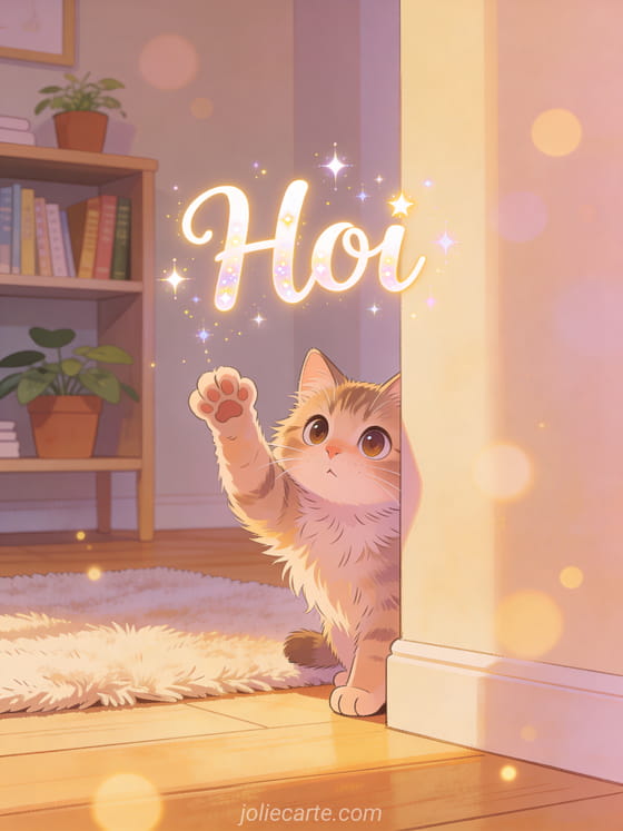 Stuur een ondeugend kat die hoi doet kaart met een nieuwsgierige kat die om een hoek gluurt met een pootje omhoog in een warme gezellige huiselijke sfeer. Ontdek ook een hoi fijne dag kusjes kaart of een hoi kusjes kaart of een kuiken hoi kaart.