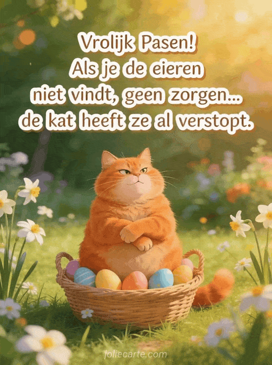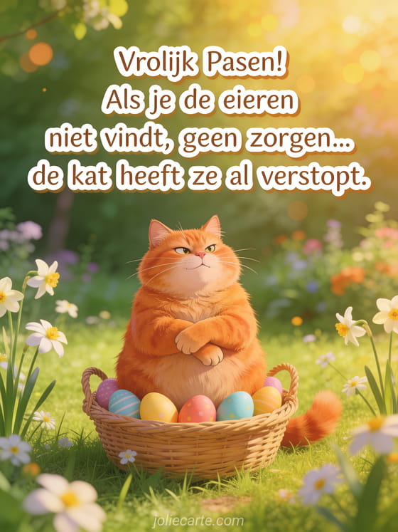 Stuur een humoristische paaskaart met een rode kat die trots zit op een mand vol paaseieren. Ontdek ook een paasei humor of een fijn paasweekend humor.