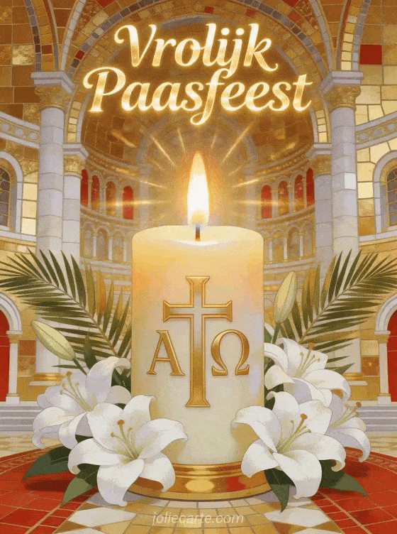 Stuur een rijke katholieke paaskaart met een verlichte paaskaars met kruis en alfa- en omega-letters, omringd door witte lelies en palmtakken op een gouden mozaïekachtergrond. Ontdek ook een christelijk pasen bericht of een religieuze pasen afbeelding.