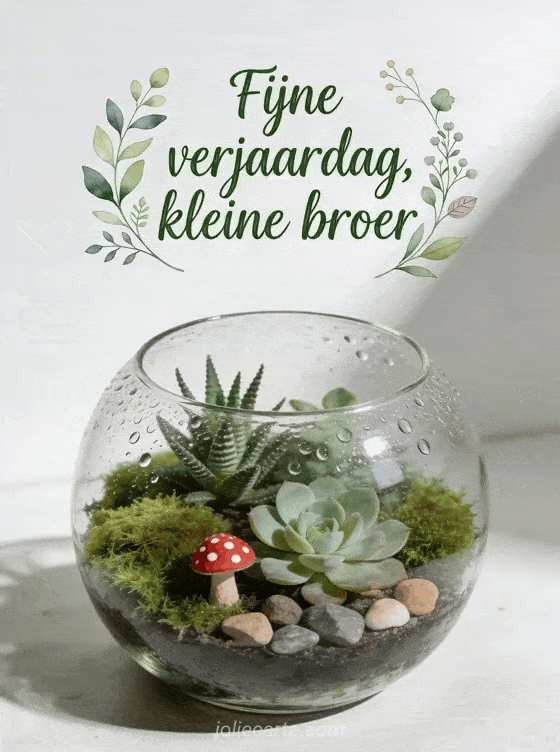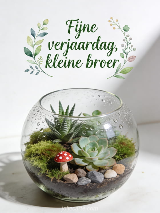 Deel een moderne botanische verjaardagskaart met een rond glazen terrarium, mini-succulenten, mos, stenen en een klein rood paddenstoeltje. Je kunt ook een fijne verjaardag mijn lieve broer, een verjaardag broer gif of een verjaardagscitaat broer kaart sturen.