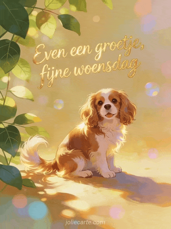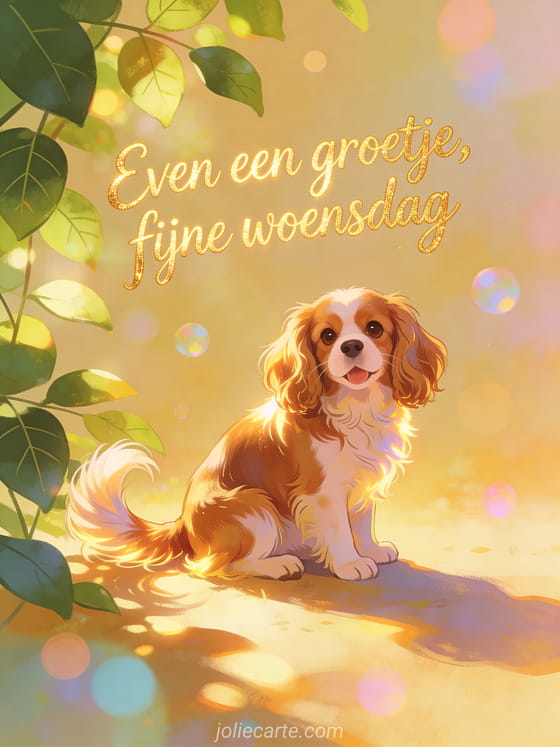 Stuur een warm groetje voor fijne woensdag met speelse letters, een Cavalier King Charles hond naast zonverlichte bladeren, zachte bokehcirkels en een kleurrijke vrolijke sfeer. Bekijk ook deze fijne woensdag geanimeerde afbeeldingen, deze fijne woensdag in de regen gif of deze fijne woensdag met wind.