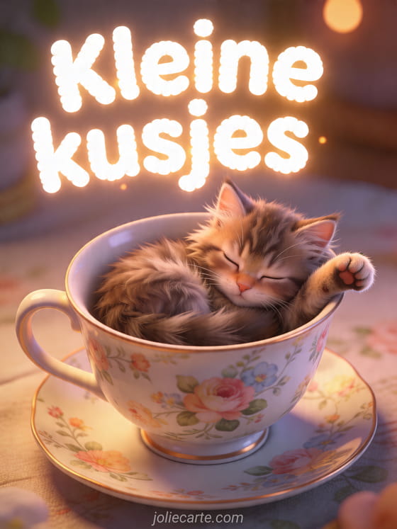 Deel een lieve kleine-kusjesgroet met deze schattige kaart van een piepkleine slapende Maine Coon kitten in een grote bloemenkop. Ontdek ook kusjes mijn hart gif, gratis ai kusjes of liefdeskusjes stel.