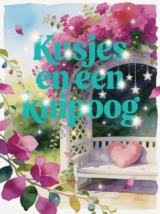 Deel een speels bericht met helder turquoise letters, sterglinsters, een tuinhoek, fuchsiabloemen, hangende sterbedels, een hartvormig kussen, vallende bladeren en feestelijk licht. Stuur ook gif kusjes sturen, een regen van kusjes gif of ik stuur je heel veel kusjes gif.