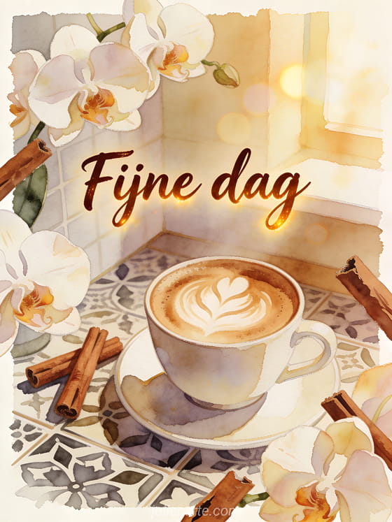 Wens iemand een fijne dag met een gezellige koffiehoek, cappuccino, kaneelstokjes, orchideeën en warm aquarellicht. Bekijk ook fijne dag kitten gif, fijne dag goedemorgen strand afbeelding of fijne dag zon gifs.