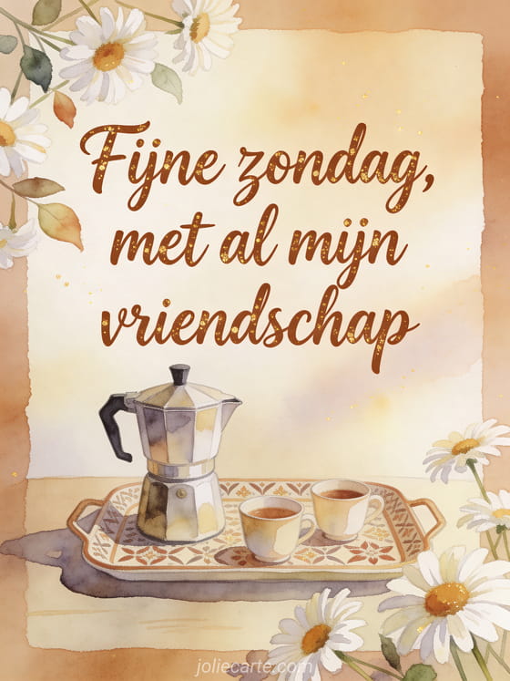 Deel een vriendelijke fijne zondag met een mokkapot, twee kleine kopjes, een ontbijtblad met patroon en margrieten in warm aquarellicht. Je kunt ook fijne zondag mooie geanimeerde afbeeldingen, mooie fijne zondag kaarten of fijne zondag wensen afbeelding delen.
