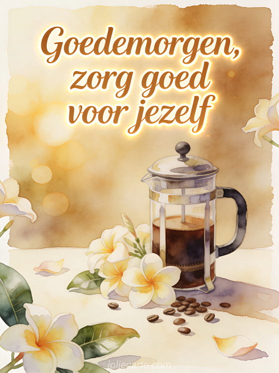 Geef een rustig ochtendmoment met deze aquarelkaart, met een glazen cafetière, rijke koffie, frangipanibloemen, glanzende bladeren en verspreide bonen. Bekijk ook goedemorgen koffie gif, leuke goedemorgen koffie afbeelding of goedemorgen goede ochtendkoffie.