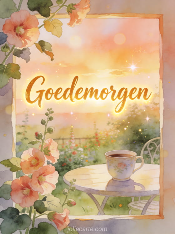 Begin de dag met een aquarelkaart vol gouden licht, stokrozen en een kopje koffie op een tuintafel. Je kunt ook goedemorgen mijn lieverd koffie, ochtend koffie koffie ochtend goedemorgen of goedemorgen goedemorgen koffie sturen.