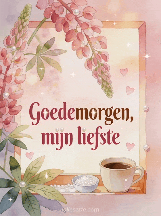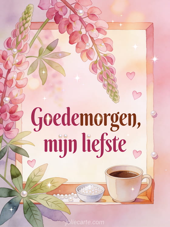 Deel een liefdevolle ochtendgedachte met deze aquarelkaart, met een koffiekopje, een klein kommetje parelsuiker, lupineblaadjes en fijne hartvormen in zacht licht. Bekijk ook ochtendkoffie goedemorgen, gratis goedemorgen koffie afbeelding of koffie goedemorgen koffie geanimeerde gif.