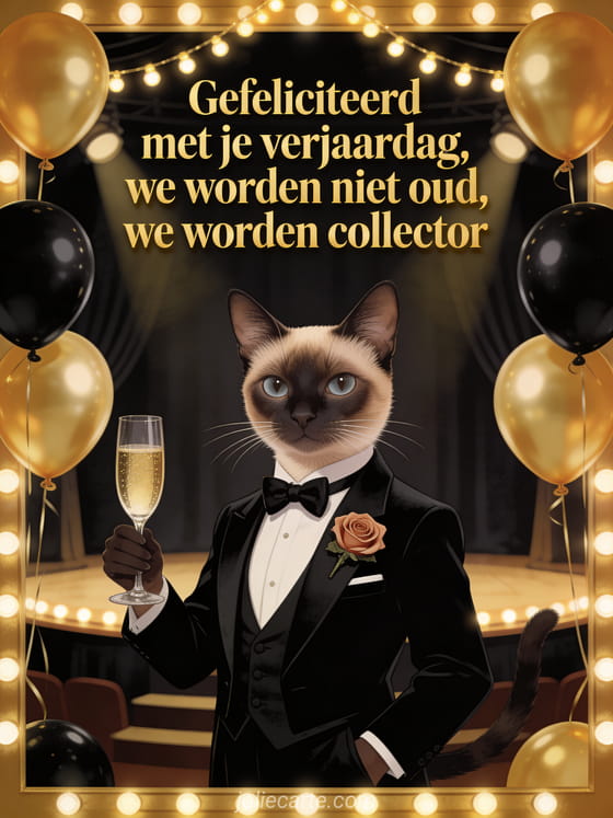 Laat hem lachen met stijl op zijn verjaardag. Een onderscheiden siamese kat in zwart smoking met een roos in het knoopsgat en een glas champagne in een cabaretsfeer met gouden en zwarte ballonnen. Ontdek ook een kaart gefeliciteerd verjaardag man gratis of een virtuele verjaardagskaart man gratis.