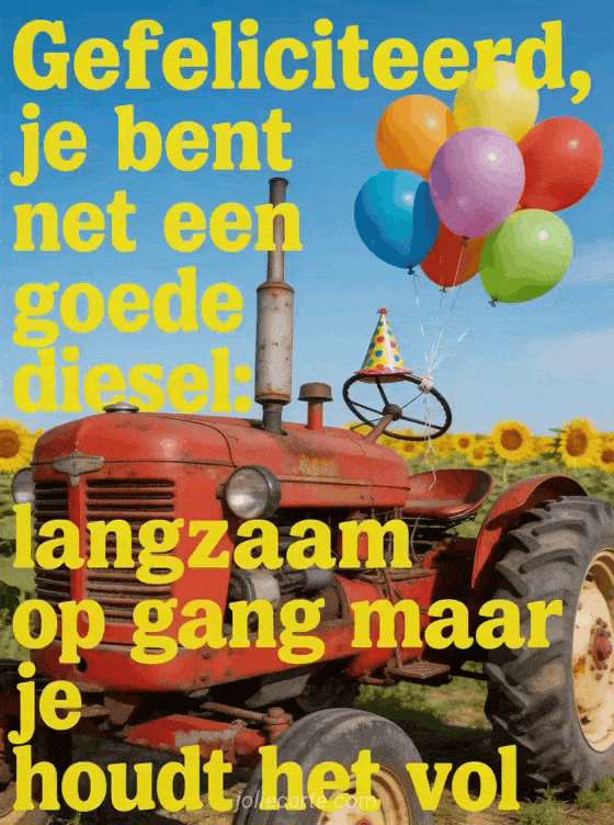 Deel deze grappige verjaardagskaart met een sympathieke oude tractor, kleurrijke ballonnen en een leuke grap over ouder worden. Bekijk ook gif verjaardag man humor gratis, mooie verjaardagskaart man en mooie gratis verjaardagskaart man dromedaris.