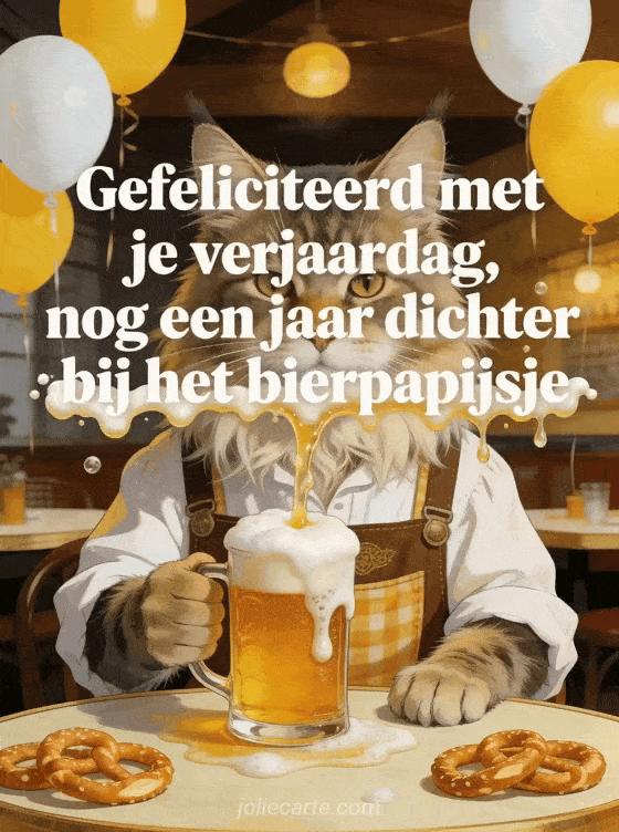 Laat hem lachen op zijn verjaardag met deze gezellige oktoberfest sfeer. Een imposante maine coon kat in brouwersbankschort houdt een schuimend bierglas vast in een brasserie vol gele ballonnen en pretzels. Ontdek ook een gratis geanimeerde verjaardagskaart man of een gifs gefeliciteerd verjaardag man.