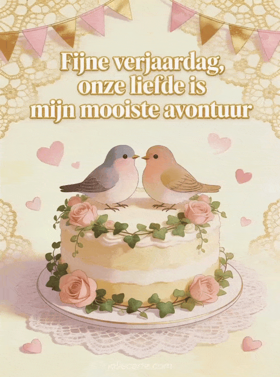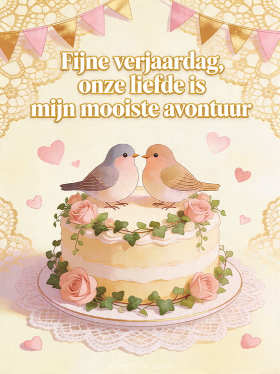 Vier de liefde met deze romantische verjaardagskaart met twee tortelduiven op een versierde taart, rozen, zwevende harten en gouden vlaggetjes. Bekijk ook fijne verjaardag mijn hart, fijne verjaardag mijn liefde ontroerende tekst op afstand of hart hart gefeliciteerd mijn liefde.