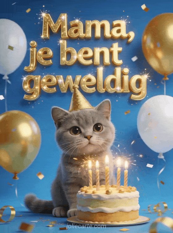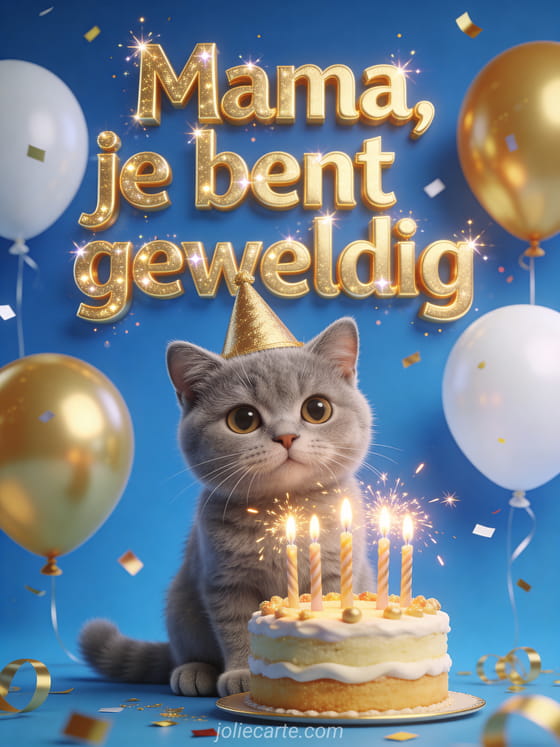 Zeg mama dat ze geweldig is met een vrolijke verjaardagskaart met een grijze Britse korthaar kat, een lichtgevende taart, gouden ballonnen en feestelijke confetti. Je kunt ook een fijne verjaardag kaart voor mama, een kaart met fijne verjaardag mama hart of een verjaardagskaart voor je eigen mama sturen.