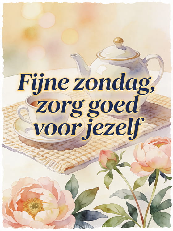 Deel een rustige fijne zondag met ronde donkerblauwe letters, een porseleinen theepot, een kopje en pioenrozen in warm ochtendlicht. Ontdek ook fijne zondag virtuele kaarten, goedemorgen fijne zondag afbeeldingen of fijne zondag afbeeldingen met bloemen.