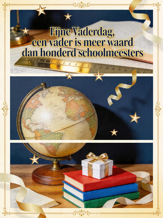 Eer papa met een realistische Vaderdagkaart die is geïnspireerd op leren en dankbaarheid, met een messing liniaal, vintage globe, kleurrijke boeken, een klein cadeau, linten en sterren. Deel deze betekenisvolle quote en bekijk ook fijne vaderdag lieve papa, fijne vaderdag papa gratis afbeelding of fijne Vaderdag papa ontroerende tekst.