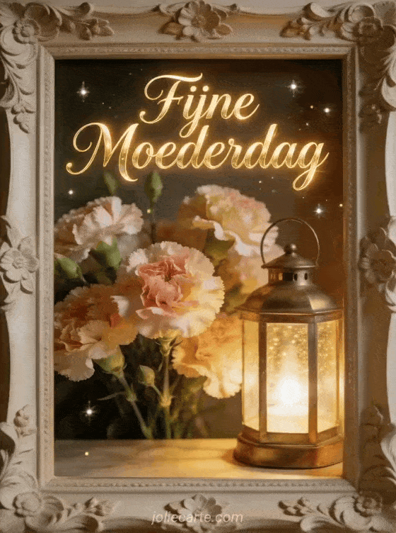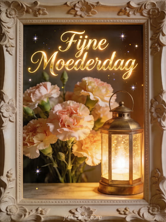 Stuur kosteloze Moederdag afbeeldingen met elegante champagnekalligrafie, warme gloed en een fotorealistische messing lantaarn naast verse anjers in een decoratieve lijst. Gouden licht en kleine fonkelingen maken deze kaart uitnodigend en feestelijk. Ontdek ook fijne Moederdag berichten, een gedicht voor Moederdag of afbeeldingen voor Moederdag.