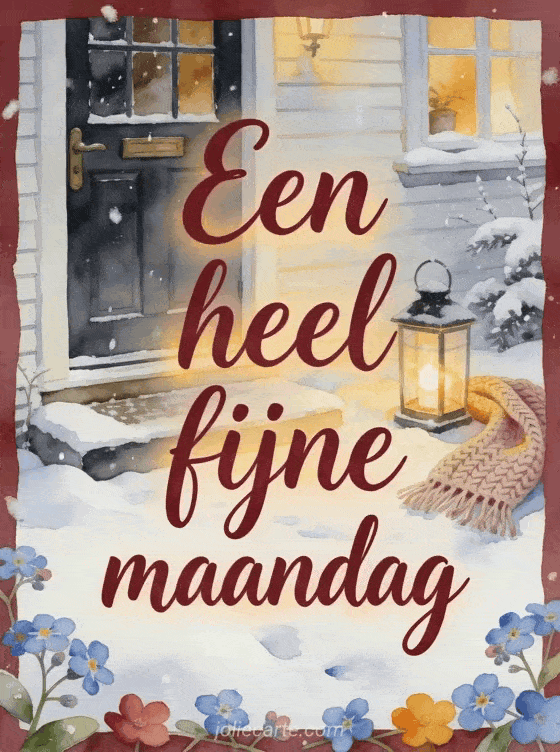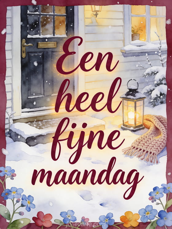Wens een heel fijne maandag met een besneeuwde cottage-drempel, een gloeiende lantaarn, een gebreide sjaal en vergeet-mij-niet-blaadjes die kleur geven aan helder winteraquarellicht. Deel deze troostende kaart en ontdek ook fijne maandag geanimeerde afbeeldingen, fijne maandag mooie afbeeldingen of warme fijne maandag afbeelding.