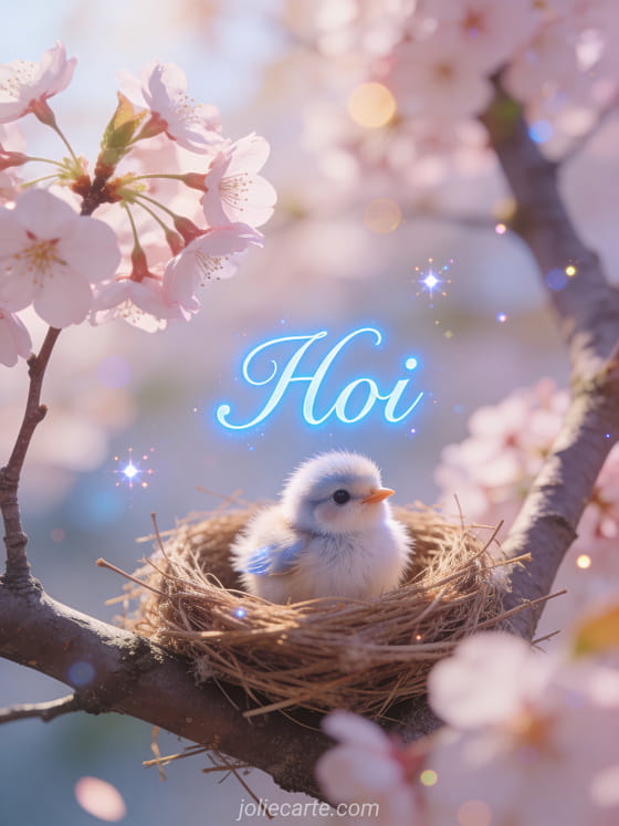 Stuur een charmante kuiken hoi kaart met een tiny donzig babyvogelkuiken in een gezellig nest op een tak met kersenbloesem in een frisse lentesfeer. Ontdek ook een hoi papa kaart of een foto hoi kaart of een gif hoi grappig kaart.