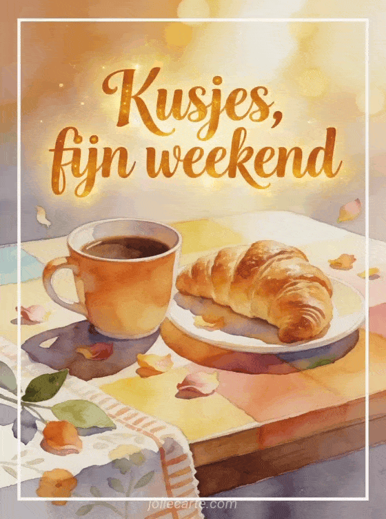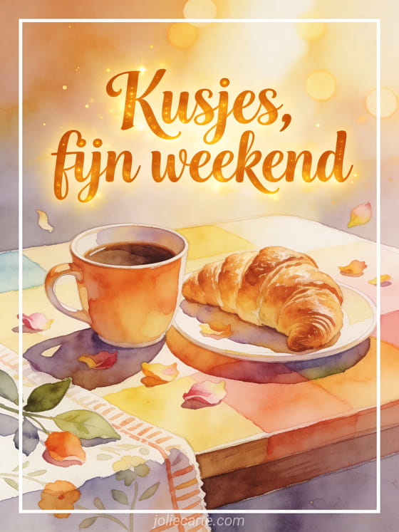 Deel een gezellige weekendgroet met honinggloedletters, een warme kop koffie, een croissant, bloembladen en een kleurrijke ontbijttafel. Ontdek ook kusjes laatste weekend van het jaar, afbeeldingen fijn weekend kusjes of kusjes mooie afbeeldingen fijn weekend.