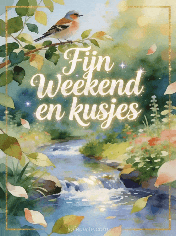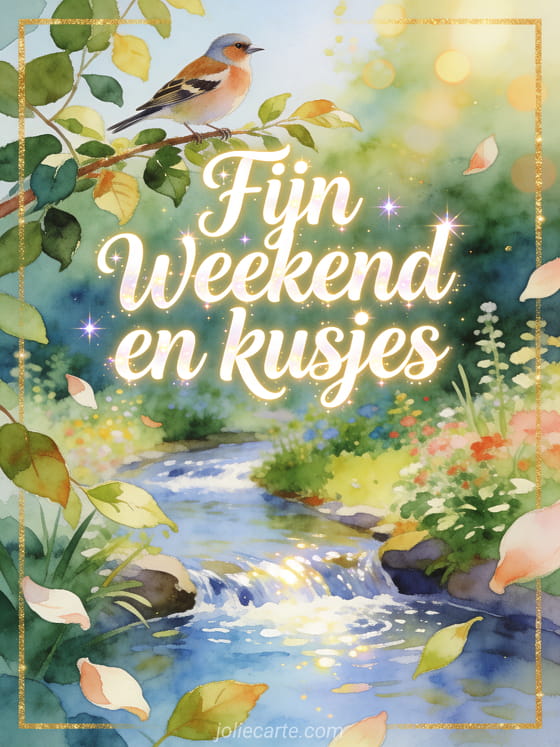 Deel een lichte weekendgroet met aquarelletters, gouden tuinlicht en lieve kusjes. Bekijk ook afbeeldingen van fijn weekend kusjes, fijn weekend lente of fijn weekend humor.
