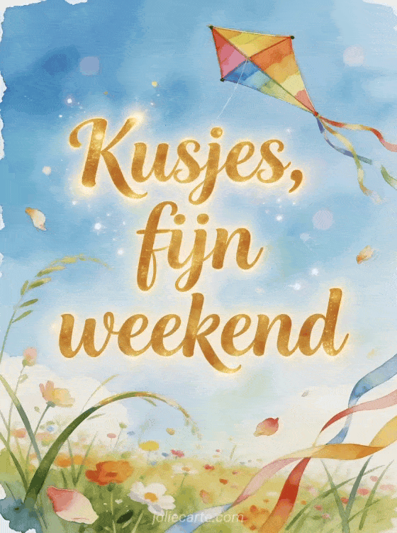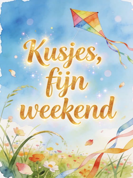 Deel een zorgeloos weekendgevoel met een kleurrijke vlieger boven een bloemrijke weide, gebogen grassen, zwevende bloemblaadjes en lintstaarten in een heldere aquarellucht. Je kunt ook dikke kussen fijn weekend, geanimeerde kusjes fijn weekend of fijn weekend dikke kus sturen.