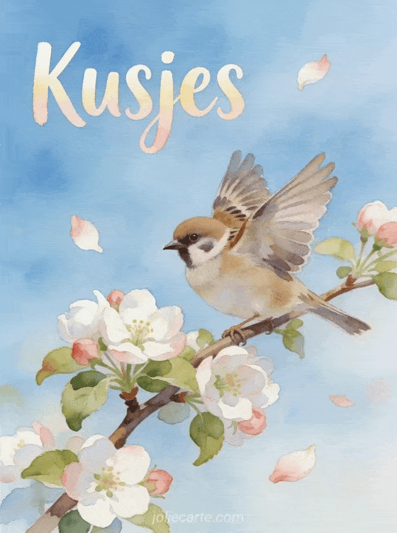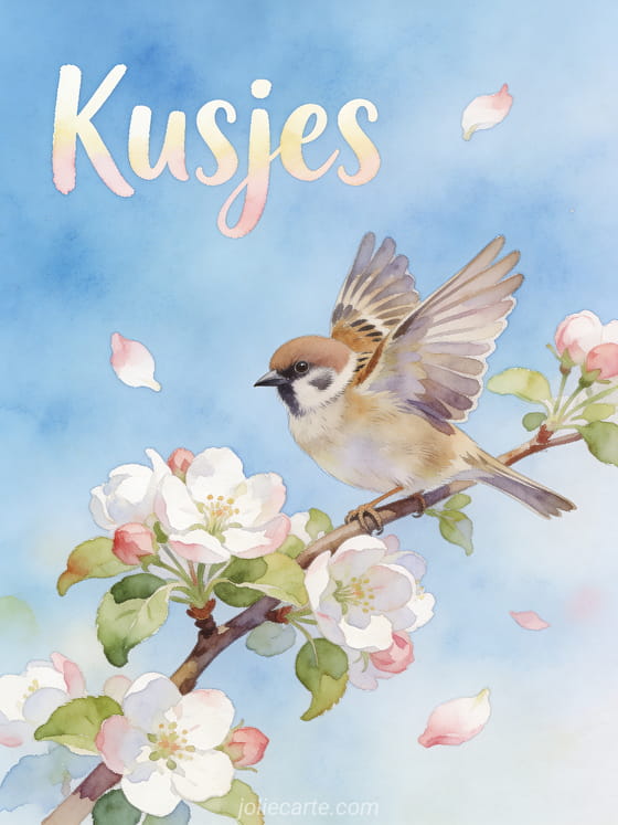Stuur tedere kusjes met deze fijne aquarelkaart met een schattig musje op een bloeiende appelboomtak. Ontdek ook sms vol kusjes of hele natte kusjes.