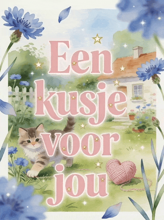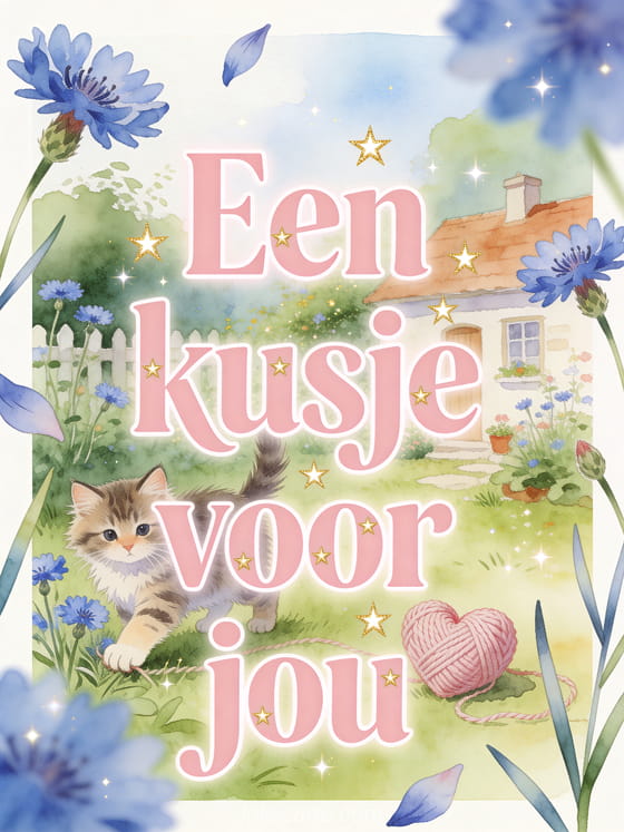 Stuur een lief kusje met een speelse Noorse boskat, korenbloemen en een hartvormige bol wol in een cottagetuin. Je kunt ook een kusjes cadeau, een aap kusjes gif of een kusjes sturen afbeelding delen.