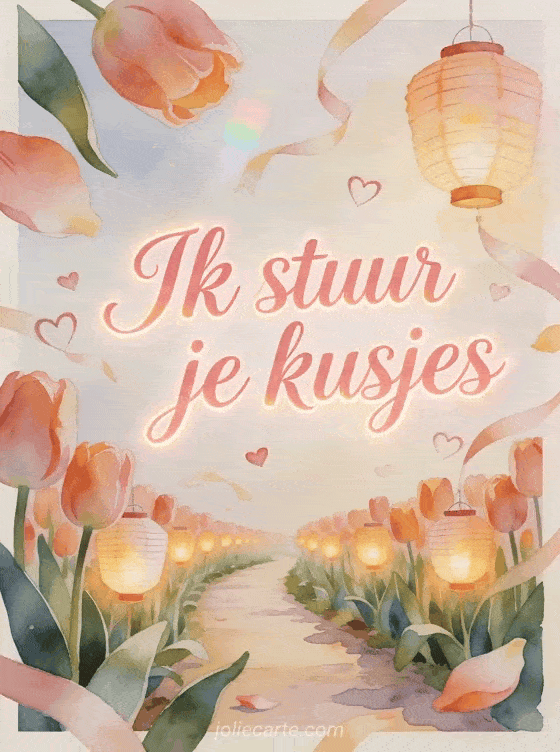 Stuur een tedere kusjesgroet met luchtig roze schrift en lichtende randen. Deze gratis kaart volgt een aquarelpad met tulpen, gloeiende papieren lantaarns, zwevende hartlinten en warm zacht licht. Bekijk ook een marmot kusjes gif, een tedere kusjes gif of een vlinderkusjes gif.