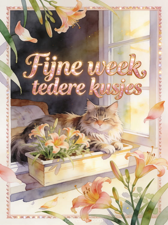 Deel een warme wens voor een fijne week met roségouden letters, een Maine Coon kat bij een zonnige bloembak vol daglelies en een zachte, liefdevolle sfeer. Ontdek ook mooie afbeeldingen fijne week kusjes, fijne week allemaal kusjes afbeeldingen of fijne week kusjes geanimeerde gifs.