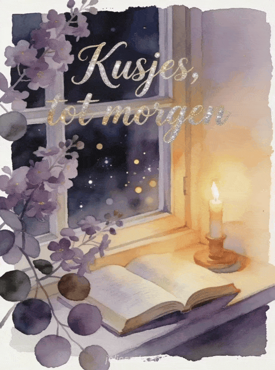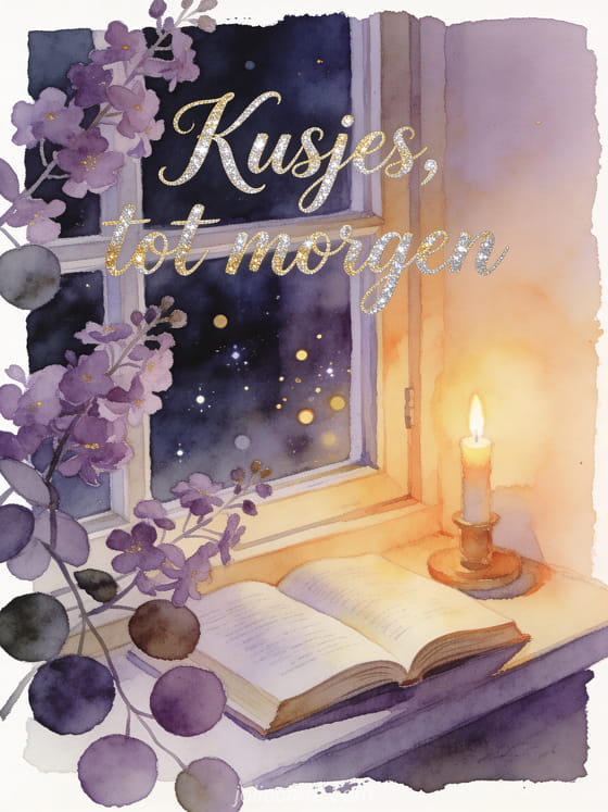 Deel een zachte avondgroet met aquarelletters, viooltjes, een brandende kaars en een open boek bij het raam. Ontdek ook een tot morgen kusjes afbeeldingen, een sterkte tot morgen kaart of een hallo tot morgen groet.