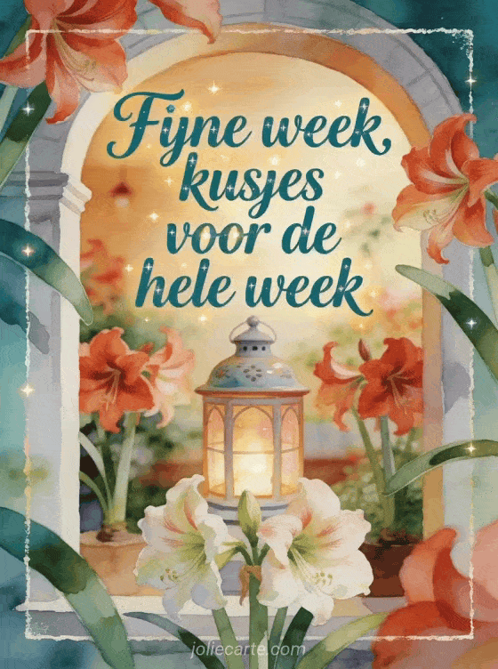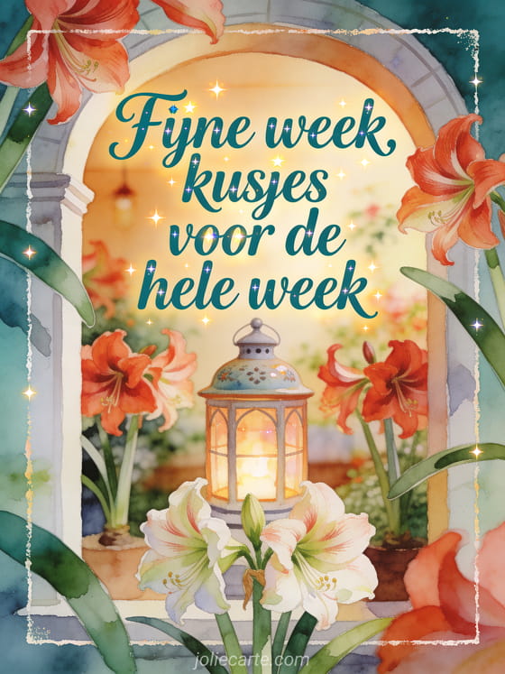 Deel een warme fijne week groet met diep petrolkleurig schrift, een keramische lantaarn, een gezellige boog en rijke amaryllisbloemen. Ontdek ook fijne week kaart kusjes, hart kusjes van de week of kusjes tederheid fijne week.