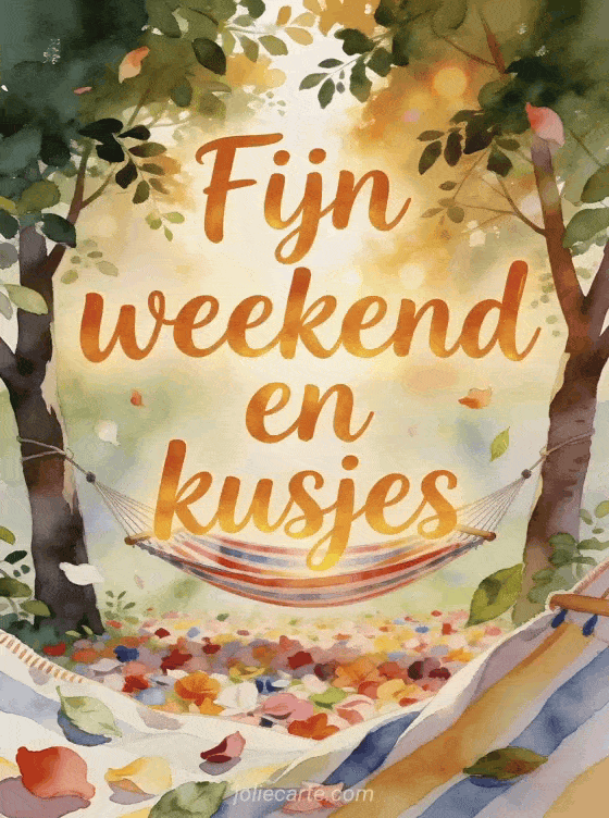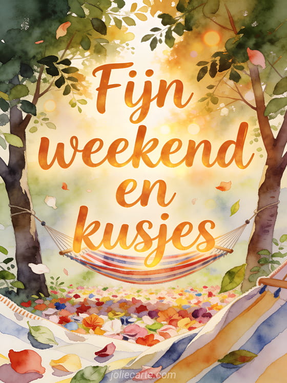 Deel een zachte weekendgroet vol genegenheid met een aquarelhangmat, groene bomen en kleurrijke bloemblaadjes. Je kunt ook een fijn weekend kusjes afbeelding, fijn weekend geanimeerde kusjes of een fijn weekend kusjes foto sturen.