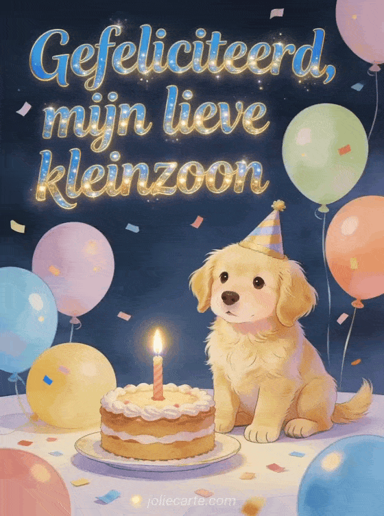 Stuur je lieve kleinzoon een tedere verjaardagsgroet met een schattige golden retriever pup met feesthoedje, een taart met een kaars, ballonnen en confetti. Ontdek ook verjaardagstekst voor mijn kleinzoon, winteruitverkoop 2022 Auchan of verjaardagswensen voor mijn kleinzoon.