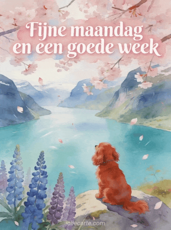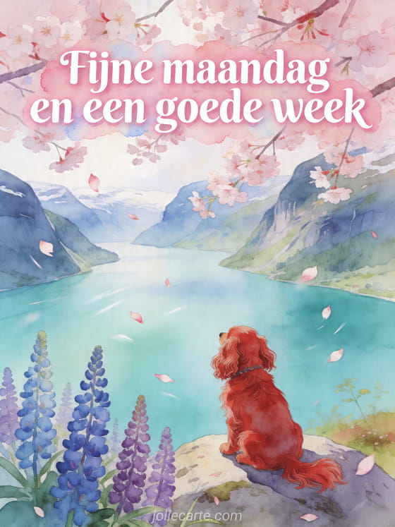 Stuur een dromerige maandag- en weekgroet met deze geïllustreerde kaart van kersenbloesem, een turquoise fjord, lupines en een Engelse cocker hond. Ontdek ook fijne maandag en goede winterweek, een fijne maandag en een goede week wensen of goedemorgen fijne maandag goedemorgen goede week.